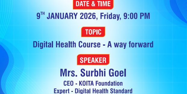 This month’s topic, “Digital Health Course – A Way Forward,” will focus on the future of digital health education and standards in healthcare practice. The session will be delivered by Mrs. Surbhi Goel, CEO – KOITA Foundation and Expert in Digital Health Standards.