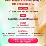 The Indian Medical Association (IMA) Hospital Board of India (HBI) invites you to its monthly meeting, IMA HBI CONNECT-6, on July 29, 2025, from 9:00 PM to 10:00 PM. The topic for discussion is “Medico legal issues for Hospitals with regards to transfer and postmortem.” The speaker is Dr. Milind Sonawane, a Medicolegal Expert & Consultant. Additionally, the IMA HBI Bulletin HOSPITAL HEALTH will be launched by National President Dr. Dilip Bhanushali. You can join the meeting on Zoom using Meeting ID: 846 6516 8269 and Passcode: imahbi, or by visiting the provided link.