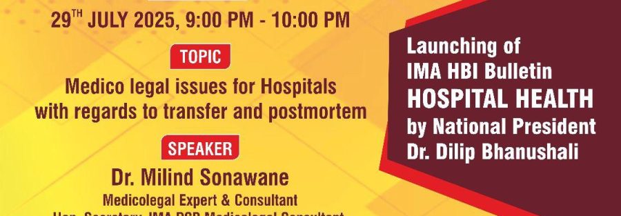 The Indian Medical Association (IMA) Hospital Board of India (HBI) invites you to its monthly meeting, IMA HBI CONNECT-6, on July 29, 2025, from 9:00 PM to 10:00 PM. The topic for discussion is “Medico legal issues for Hospitals with regards to transfer and postmortem.” The speaker is Dr. Milind Sonawane, a Medicolegal Expert & Consultant. Additionally, the IMA HBI Bulletin HOSPITAL HEALTH will be launched by National President Dr. Dilip Bhanushali. You can join the meeting on Zoom using Meeting ID: 846 6516 8269 and Passcode: imahbi, or by visiting the provided link.